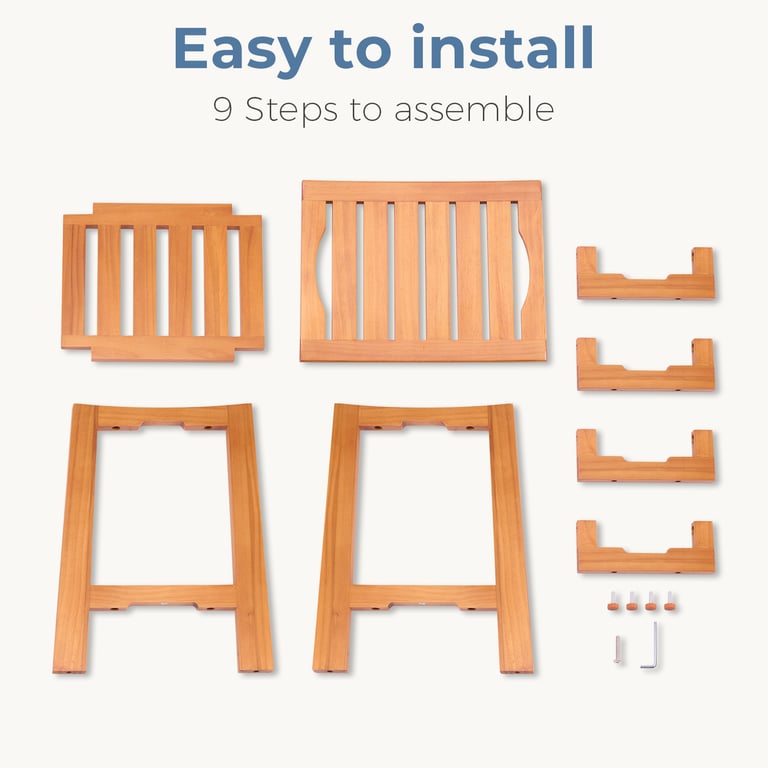<p>Finding the right bathroom seating solution shouldn't mean sacrificing style or durability. Our 18-inch solid wood bathroom stool combines elegant craftsmanship with practical functionality, delivering a premium addition to any Canadian home's shower or vanity area.</p><ul><li><strong>Genuine Solid Wood Construction</strong> — Crafted from sustainably sourced hardwood with visible grain patterns, ensuring longevity and natural beauty that resists warping in humid bathroom environments</li><li><strong>Curved Ergonomic Seat Design</strong> — The contoured wooden seat distributes weight evenly, reducing strain during extended use while the slatted design promotes water drainage in shower settings</li><li><strong>Integrated Lower Storage Shelf</strong> — Provides convenient space for bath products, towels, or personal items without requiring additional furniture, maximizing small bathroom layouts</li><li><strong>Dual Grab Handles</strong> — Reinforced side handles offer stability and support for users with mobility concerns, seniors, or anyone needing assistance entering or exiting the shower</li><li><strong>Tool-Free 9-Step Assembly</strong> — Pre-drilled components and included hardware mean setup takes under 15 minutes without specialized tools or professional installation</li></ul><p><strong>Perfect for:</strong> Elderly caregivers seeking accessible bathroom modifications, small apartment dwellers optimizing tight spaces, and homeowners building spa-like shower experiences with natural wood accents.</p><p>Constructed from premium hardwood with a honey-brown finish that complements modern and traditional bathroom décor. Dimensions: 18 inches tall, compact footprint ideal for shower corners or vanity areas.</p><p>✅ Fast shipping across Canada · 30-day returns · Secure checkout</p><p>Stock is limited—order today to upgrade your bathroom comfort before seasonal demand peaks.</p>