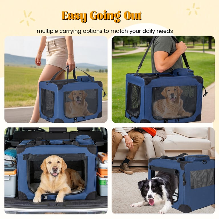 <p>Traveling with your furry friend shouldn't mean sacrificing comfort or safety—our 36-inch soft dog crate delivers a secure, breathable sanctuary for dogs, cats, and rabbits wherever life takes you. Whether you're road-tripping across Canada, visiting the vet, or creating a calm indoor retreat, this portable pet carrier combines premium construction with thoughtful design features that pet owners genuinely need.</p><ul><li><strong>Three-Door Access Design</strong> — Front, side, and top entry points eliminate awkward positioning when loading or retrieving your pet, reducing stress for both you and your animal</li><li><strong>Advanced Ventilation System</strong> — Mesh windows on all sides provide 360-degree airflow and visibility, preventing anxiety while maintaining secure containment during transport</li><li><strong>Dual Carrying Options</strong> — Reinforced top handle plus removable shoulder strap adapt to your carrying preference, whether you're navigating airport terminals or moving between rooms</li><li><strong>Foldable Storage Design</strong> — Collapses flat for compact storage in closets, vehicles, or apartments, saving valuable space when not in active use</li><li><strong>Included Fleece Comfort Mat</strong> — Removable, washable padding creates a cozy den-like environment that encourages natural nesting behavior and reduces travel anxiety</li></ul><p><strong>Perfect for:</strong> Multi-pet households managing separate spaces, frequent travelers needing TSA-compliant pet transport, and outdoor enthusiasts who camp or hike with their companions.</p><p>Constructed from durable tear-resistant fabric with reinforced corner stitching and heavy-duty zippers rated for repeated use. Dark blue exterior resists visible dirt and stains during outdoor adventures.</p><p>✅ Fast shipping across Canada · 30-day returns · Secure checkout</p><p>Stock is moving quickly—secure your pet's travel companion before sizes sell out this season.</p>