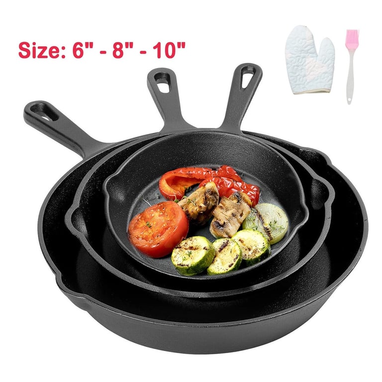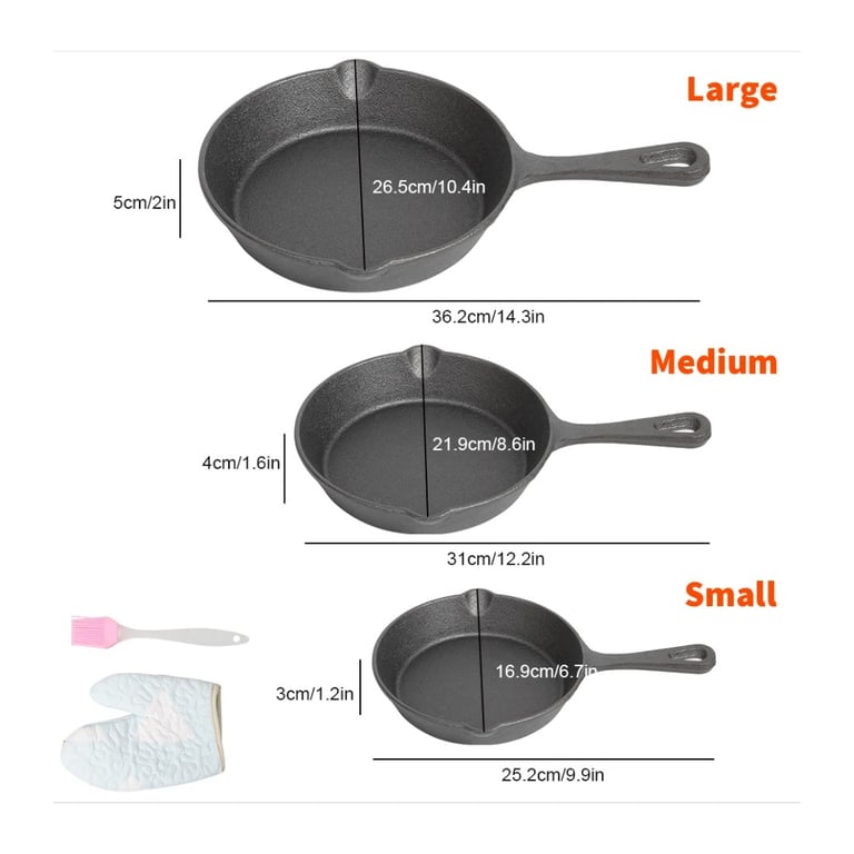 <p>Tired of juggling multiple pans or settling for flimsy cookware that warps and sticks? Our 3-piece cast iron skillet set delivers restaurant-quality cooking performance with three versatile sizes that handle everything from delicate eggs to seared steaks.</p><ul><li><strong>Pre-Seasoned Non-Stick Surface</strong> — Factory-treated with natural oil coating eliminates initial seasoning hassle and provides immediate non-stick performance without synthetic chemicals</li><li><strong>Three Optimized Sizes</strong> — Small (8-inch), medium (10-inch), and large (12-inch) skillets cover breakfast omelets, weeknight dinners, and family gatherings in one complete set</li><li><strong>Lifetime Heat Retention</strong> — Cast iron's superior thermal mass distributes heat evenly across the cooking surface, maintaining consistent temperatures for perfectly seared proteins and vegetables</li><li><strong>Includes Essential Accessories</strong> — Silicone oven mitt and basting brush bundled with set eliminate separate purchases and streamline your cooking workflow</li><li><strong>Hanging-Ready Design</strong> — Integrated loop handles allow wall storage to save cabinet space while keeping your most-used pans within arm's reach</li></ul><p><strong>Perfect for:</strong> Home chefs upgrading from non-stick aluminum, camping enthusiasts seeking durable outdoor cookware, and meal-prep professionals who need reliable multi-size cooking capacity.</p><p>Constructed from solid cast iron with food-safe pre-seasoning that improves with every use. Each skillet is individually tested for durability and heat distribution consistency.</p><p>✅ Free shipping across Canada · 30-day satisfaction guarantee · Secure checkout with buyer protection</p><p>Stock is limited—cast iron sets this complete rarely stay in inventory beyond 2-3 weeks.</p>