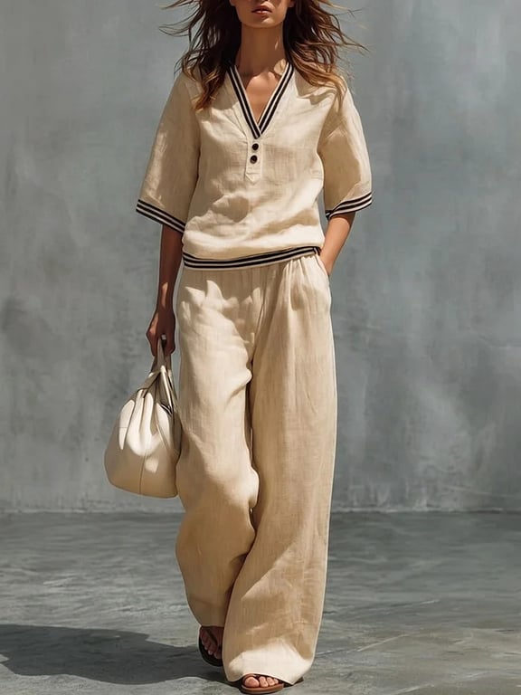 <p>Tired of spending hours coordinating outfits that feel stiff and uncomfortable? Our cotton-linen V-neck casual set solves the outfit puzzle with effortless style and breathable all-day comfort that actually moves with your body.</p><ul><li><strong>Premium Cotton-Linen Blend Fabric</strong> — 55% cotton, 45% linen construction provides superior breathability and natural temperature regulation, perfect for Canadian spring through fall seasons</li><li><strong>Relaxed Wide-Leg Silhouette</strong> — Flattering cut designed for women 25-55 who prioritize comfort without sacrificing modern style; elastic waistband eliminates pinching</li><li><strong>Functional Design Details</strong> — Contrasting V-neck trim, button-down front closure, and deep pockets on pants provide both aesthetic appeal and everyday practicality</li><li><strong>Lightweight & Wrinkle-Resistant</strong> — Natural linen fibers resist creasing better than pure cotton, reducing ironing time while maintaining a polished appearance</li><li><strong>Versatile Color Range</strong> — Available in light blue, black, beige, pink, and brown; each shade coordinates seamlessly for multiple outfit combinations from one purchase</li></ul><p><strong>Perfect for:</strong> Work-from-home professionals seeking elevated loungewear, weekend brunch outings, casual office environments, and travel wardrobes where lightweight packing matters.</p><p>Crafted from natural, sustainable fibers with reinforced seams and quality stitching throughout. Machine washable and fade-resistant with proper care.</p><p>✅ Fast shipping across Canada · 30-day returns · Secure checkout</p><p>Limited stock in trending colors—grab yours before sizes sell out this season.</p>