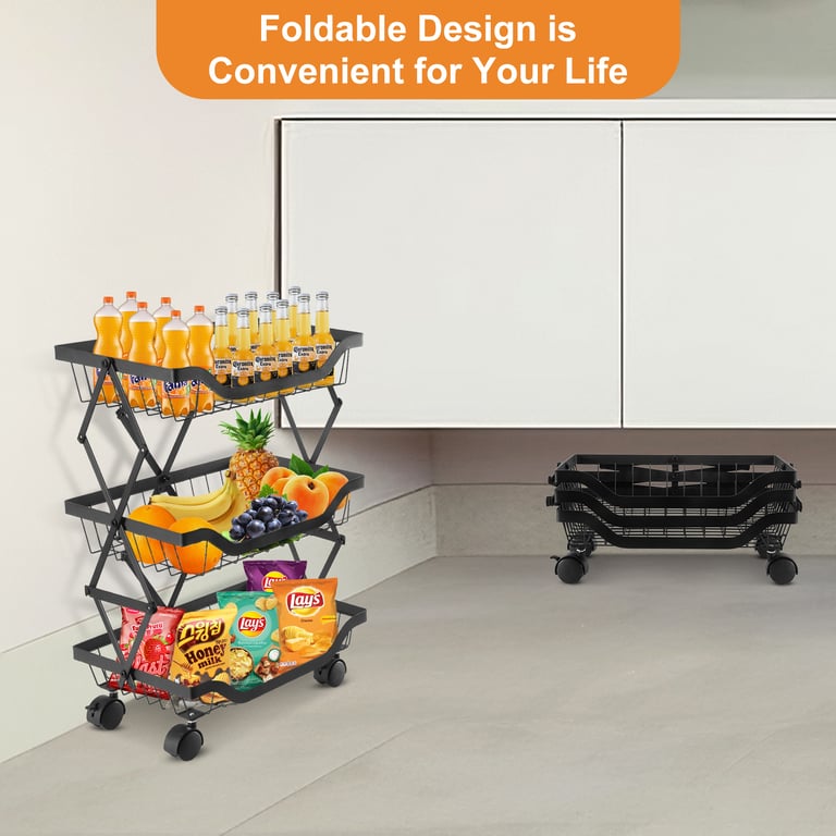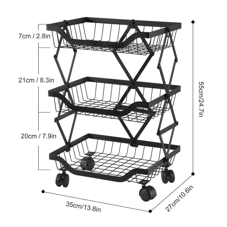 <p>Struggling with cluttered countertops and overflowing produce? Our multi-layer kitchen storage rack transforms cramped kitchens into organized, functional spaces with smart vertical storage that maximizes every inch of floor real estate.</p><ul><li><strong>Three-Tier Wire Basket Design</strong> — Holds vegetables, fruits, pantry items, and household goods across 3 independent shelves, each supporting up to 15 lbs for balanced weight distribution</li><li><strong>Foldable Frame for Compact Storage</strong> — Collapses flat when not in use, fitting easily into closets or behind doors; perfect for renters and small apartments with limited space</li><li><strong>Smooth-Rolling Wheels</strong> — Four swivel casters enable effortless repositioning between kitchen, laundry room, bedroom, or pantry without scratching floors</li><li><strong>Durable Powder-Coated Metal Construction</strong> — Black finish resists rust and staining; engineered for long-term durability in high-humidity kitchen environments</li><li><strong>Compact Footprint Design</strong> — Fits snugly in narrow kitchen gaps, between appliances, or alongside cabinets; ideal for studio apartments and galley kitchens</li></ul><p><strong>Perfect for:</strong> Apartment dwellers maximizing small kitchen storage, families organizing bulk produce and pantry overflow, and anyone needing flexible storage solutions that adapt to seasonal needs.</p><p>Made from heavy-duty metal with a professional powder-coated finish that withstands daily kitchen use and moisture exposure. Assembled and ready to roll straight out of the box.</p><p>✅ Fast shipping across Canada · 30-day returns · Secure checkout</p><p>Stock is limited — organize your kitchen today before this bestselling storage solution sells out.</p>