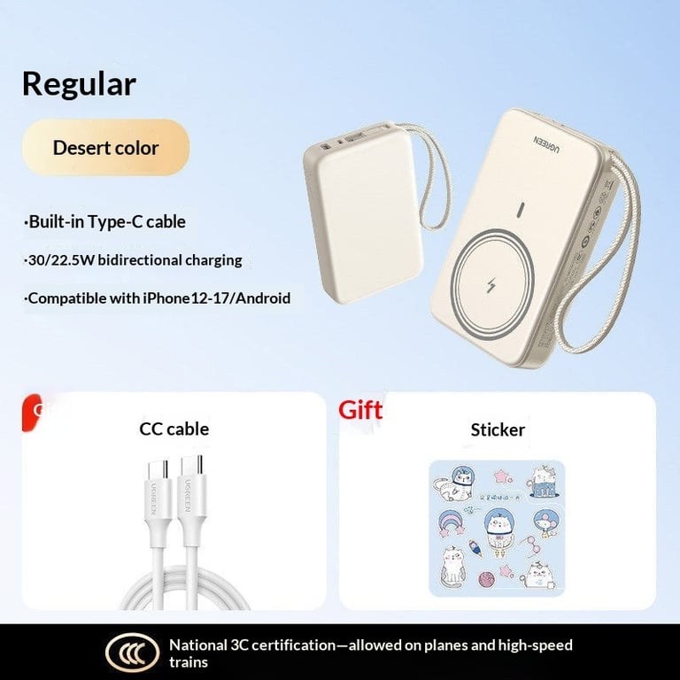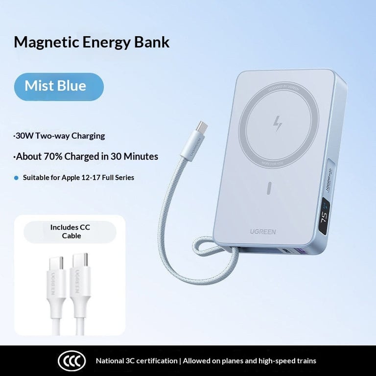 <p>Running out of battery mid-day kills productivity—especially when you're away from outlets. Our magnetic wireless power bank delivers instant charging freedom with premium 20W fast-charging technology and seamless magnetic attachment designed for iPhone 12-17 and Android devices.</p><ul><li><strong>Magnetic wireless charging</strong> — Snap-on alignment technology eliminates fumbling with cables; charges iPhone 12-17 series at optimal angles without removing protective cases</li><li><strong>10000mAh capacity</strong> — Provides 2-3 full iPhone charges or 1-2 Android device charges, verified by National 3C certification for safety and performance</li><li><strong>Dual charging ports</strong> — Built-in USB-C cable plus additional USB-C input port allows simultaneous charging of power bank and secondary device</li><li><strong>Compact portable design</strong> — Rectangular form with rounded edges fits easily into backpacks, crossbody bags, or jacket pockets without bulk</li><li><strong>Multi-device compatibility</strong> — Works with iPhone 12, 13, 14, 15, 16, 17 and all Qi-enabled Android phones; includes decorative stickers for personalization</li></ul><p><strong>Perfect for:</strong> Remote workers juggling video calls and emails, frequent travelers crossing time zones, outdoor enthusiasts hiking or camping, and students managing all-day campus schedules.</p><p>Premium UGREEN construction with National 3C certification ensures reliable charging cycles and device safety. Available in Mist Blue and Desert colorways.</p><p>✅ Fast shipping across Canada · 30-day returns · Secure checkout</p><p>Stock is limited—secure yours today before this capacity sells out.</p>