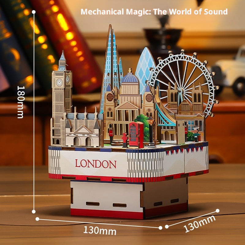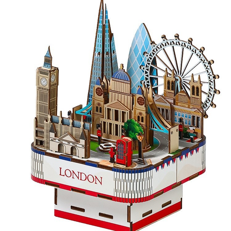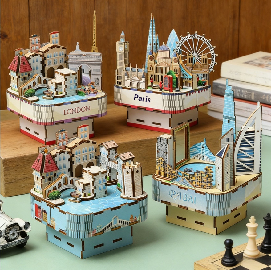<p>Searching for a gift that combines creativity, nostalgia, and décor? Our 3D wooden puzzle music box transforms idle hands into engaged minds while delivering a stunning handcrafted centerpiece that plays enchanting melodies.</p><ul><li><strong>Laser-cut precision engineering</strong> — 130mm × 130mm × 180mm assembled dimensions with intricate wooden layers capturing iconic landmarks like Big Ben, Eiffel Tower, and Burj Khalif</li><li><strong>Dual-function entertainment</strong> — Functions as both an interactive puzzle activity (60–90 minute assembly) and a working music box with rotating base mechanism</li><li><strong>Hand-painted artisan details</strong> — Pastel color finishes on each wooden piece create museum-quality aesthetics suitable for shelves, desks, or gift displays</li><li><strong>Cognitive skill development</strong> — Spatial reasoning and fine motor engagement ideal for teens and adults seeking screen-free hobbies and mindfulness activities</li><li><strong>Premium material construction</strong> — Sustainably sourced wood with non-toxic finishes; no glue required, pieces interlock seamlessly for durability</li></ul><p><strong>Perfect for:</strong> Travel enthusiasts decorating with architectural models, puzzle hobbyists seeking unique challenges beyond traditional jigsaws, and gift-givers targeting creative adults aged 16+</p><p>Each music box arrives with assembly instructions and operates via a smooth mechanical wind mechanism—no batteries needed.</p><p>✅ Fast shipping across Canada · 30-day returns · Secure checkout</p><p>Limited stock on select city designs—order today to secure your favorite skyline.</p>