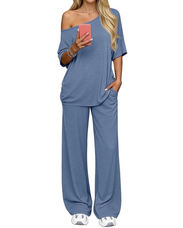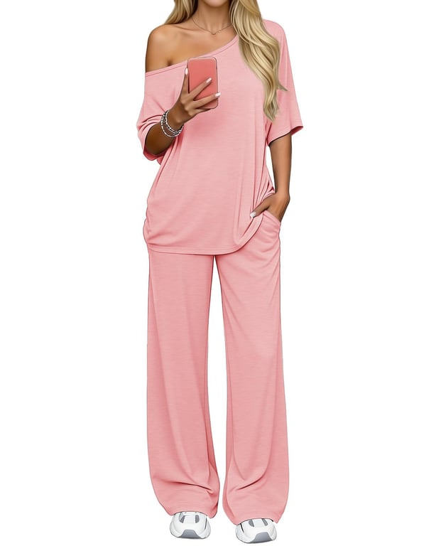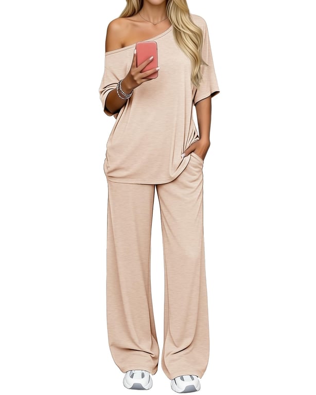 <p>Tired of mismatched outfits that don't feel put-together? This off-shoulder two-piece set delivers effortless style with a coordinated top and pants combination that works for any casual occasion. You'll finally have a complete, polished look without the styling stress.</p><ul><li><strong>Off-shoulder neckline design</strong> — Creates a flattering, modern silhouette that elongates the neck and shoulders while maintaining comfort for all-day wear</li><li><strong>Wide-leg pants with elastic waistband</strong> — Provides unrestricted movement and a forgiving fit that accommodates different body types without sacrificing style</li><li><strong>Soft rayon-polyester blend fabric</strong> — Breathable material with natural drape that feels luxurious against skin while resisting wrinkles during travel or daily activities</li><li><strong>Functional front pockets on both pieces</strong> — Practical storage on both top and pants eliminates the need for a separate bag for essentials like phone and keys</li><li><strong>Available in four versatile colorways</strong> — Blue, pink, beige, and olive green options coordinate with existing wardrobes and suit multiple seasons and skin tones</li></ul><p><strong>Perfect for:</strong> Work-from-home professionals seeking comfortable loungewear, weekend brunch outings with friends, or casual date nights where you want to look effortlessly put-together without trying too hard.</p><p>The relaxed fit and premium fabric blend ensure this set maintains its shape wash after wash, making it a reliable staple for your casual rotation.</p><p>✅ Fast shipping across Canada · 30-day returns · Secure checkout</p><p>Stock is moving quickly—secure your preferred color before sizes sell out.</p>