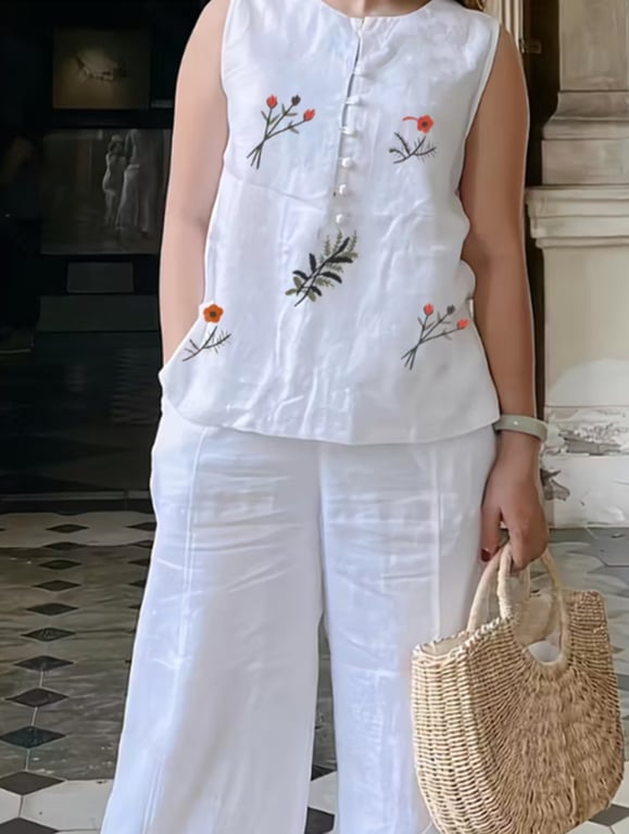 <p>Finding a coordinated outfit that feels effortless yet polished is challenging—this white women's set solves that instantly with its thoughtfully designed two-piece silhouette. Pair comfort with elegance without the styling stress.</p><ul><li><strong>Delicate Floral Embroidery</strong> — Hand-detailed botanical patterns on the sleeveless top add feminine sophistication while maintaining a casual, bohemian aesthetic perfect for warm-weather occasions</li><li><strong>Mandarin Collar Design</strong> — Structured neckline with button-down front provides a refined, intentional look that flatters multiple body types and elevates casual wear</li><li><strong>Wide-Leg Cropped Pants</strong> — Relaxed fit through the hip and thigh with cropped length creates an elongating silhouette while allowing unrestricted movement for all-day comfort</li><li><strong>Breathable Linen Blend</strong> — Premium fabric composition wicks moisture and regulates temperature, ideal for Canadian spring and summer transitions without clinging or wrinkling excessively</li><li><strong>Coordinated Two-Piece Solution</strong> — Pre-matched top and bottom eliminate guesswork, saving time on outfit assembly while ensuring color harmony and proportional balance</li></ul><p><strong>Perfect for:</strong> Weekend brunch outings, casual garden events, work-from-home comfort styling, and travel wardrobes where versatility matters.</p><p>Crafted from premium polyester-linen blend with meticulous embroidery detailing. Each set undergoes quality inspection before shipping.</p><p>✅ Fast shipping across Canada · 30-day returns · Secure checkout</p><p>Stock is limited—secure your set before sizes sell out this season.</p>