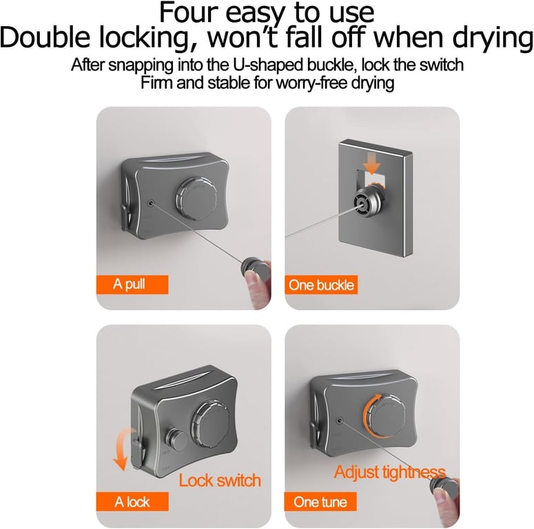 <p>Tired of unsightly drying racks cluttering your home or struggling with permanent clotheslines that damage walls? Our retractable clothesline combines space-saving design with industrial-strength performance, delivering a clean aesthetic that disappears when not in use.</p><ul><li><strong>Stainless Steel Rope Construction</strong> — Corrosion-resistant material withstands Canadian weather extremes and maintains integrity through thousands of extend-retract cycles without fraying or rust spots</li><li><strong>Locking Mechanism Prevents Sagging</strong> — Dual-lock system holds rope taut at any extension length, supporting up to 22 kg of wet laundry without drooping or rope slippage</li><li><strong>Wall-Mounted Installation</strong> — Compact gray housing unit mounts securely to studs or drywall using included brackets; extends up to 2.5 meters for maximum drying capacity in minimal footprint</li><li><strong>Indoor and Outdoor Versatility</strong> — Sealed housing protects retraction mechanism from moisture; suitable for laundry rooms, balconies, patios, and garages across all Canadian climates</li><li><strong>Tool-Free Adjustment System</strong> — Buckle and tightness controls allow one-handed operation; no wrenches or screwdrivers needed for tension tuning or rope length customization</li></ul><p><strong>Perfect for:</strong> Apartment dwellers maximizing small spaces, eco-conscious families reducing energy costs, and homeowners seeking an elegant alternative to bulky drying racks or permanent clotheslines.</p><p>Heavy-duty stainless steel rope paired with reinforced plastic housing ensures durability through years of daily use. Dimensions: 65cm width × 8cm depth × 8cm height when retracted.</p><p>✅ Fast shipping across Canada · 30-day returns · Secure checkout</p><p>Stock is limited—secure your space-saving solution before this season's inventory runs out.</p>
