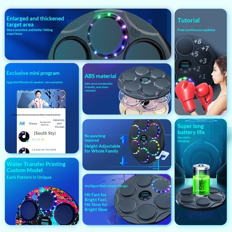 <p>Transform your home workouts into an electrifying rhythm-based boxing experience with this Smart Music Boxing Machine Wall Target. Say goodbye to monotonous training sessions and hello to gamified fitness that keeps you motivated and engaged every single day.</p><ul><li><strong>LED Light-Up Target System</strong> — Hexagonal padded striking points illuminate in synchronized sequences, guiding your punches with precision and visual feedback that mirrors professional boxing training setups</li><li><strong>Bluetooth Music Integration</strong> — Connect your smartphone or tablet to sync workouts with your favorite tracks, transforming cardio into a high-energy dance-boxing fusion that makes time fly</li><li><strong>Adjustable Difficulty Levels</strong> — Progressive speed settings accommodate beginners through advanced athletes, with customizable intensity that grows with your fitness journey and skill development</li><li><strong>Space-Saving Wall Mount Design</strong> — Compact hexagonal construction mounts securely to any wall, freeing up floor space while delivering a full-body cardio and coordination workout in tight apartments or home gyms</li><li><strong>Durable Eco-Friendly Materials</strong> — Premium ABS plastic frame combined with high-elastic PU padding absorbs impact safely, engineered for thousands of strikes while maintaining structural integrity and sound insulation</li></ul><p><strong>Perfect for:</strong> Home gym enthusiasts seeking interactive cardio alternatives, fitness gamers who thrive on rhythm-based challenges, and parents introducing children to boxing fundamentals through engaging, music-synchronized training.</p><p>Built with environmentally responsible materials and engineered for durability, this wall-mounted boxing target combines entertainment with serious fitness results.</p><p>✅ Fast shipping across Canada · 30-day returns · Secure checkout</p><p>Stock is moving quickly—secure your smart boxing machine today and revolutionize your home fitness routine.</p>