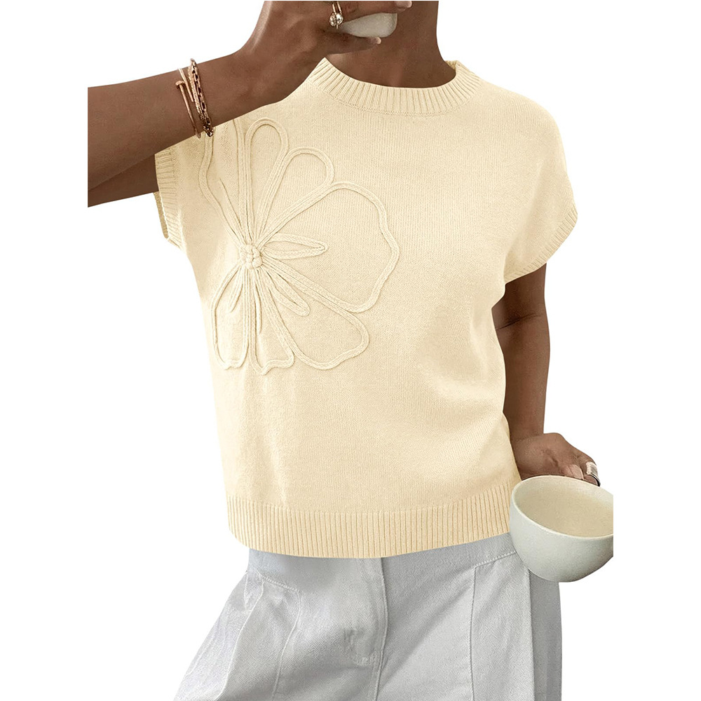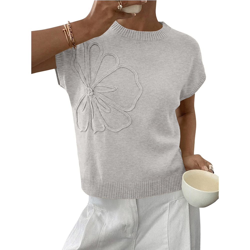 Jacquard Womens Knitted Short-Sleeve Flower Sweater | Soft Casual Top