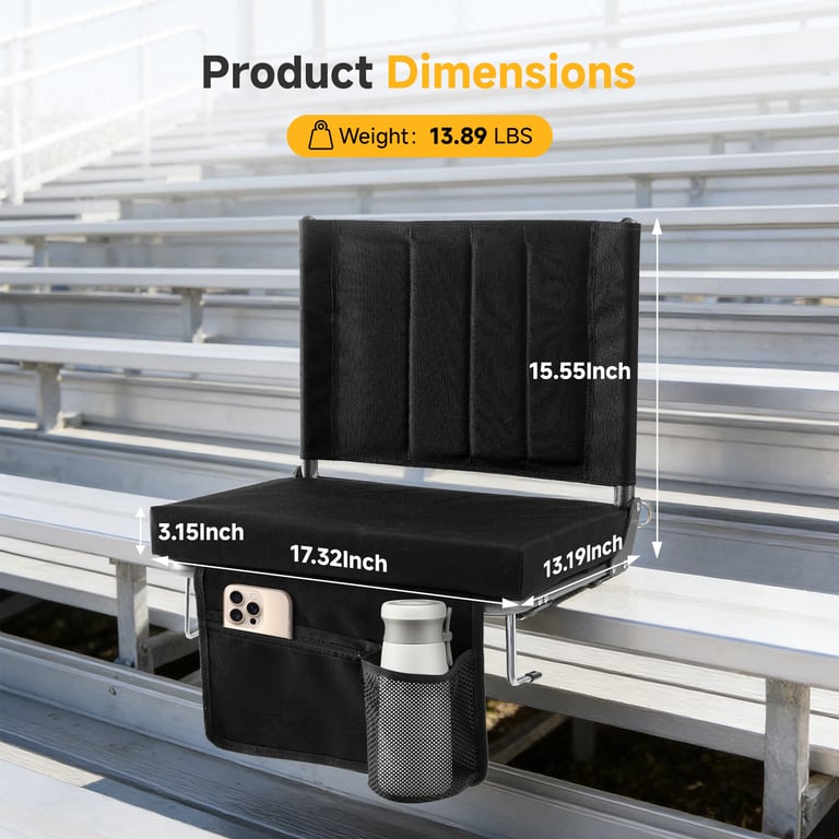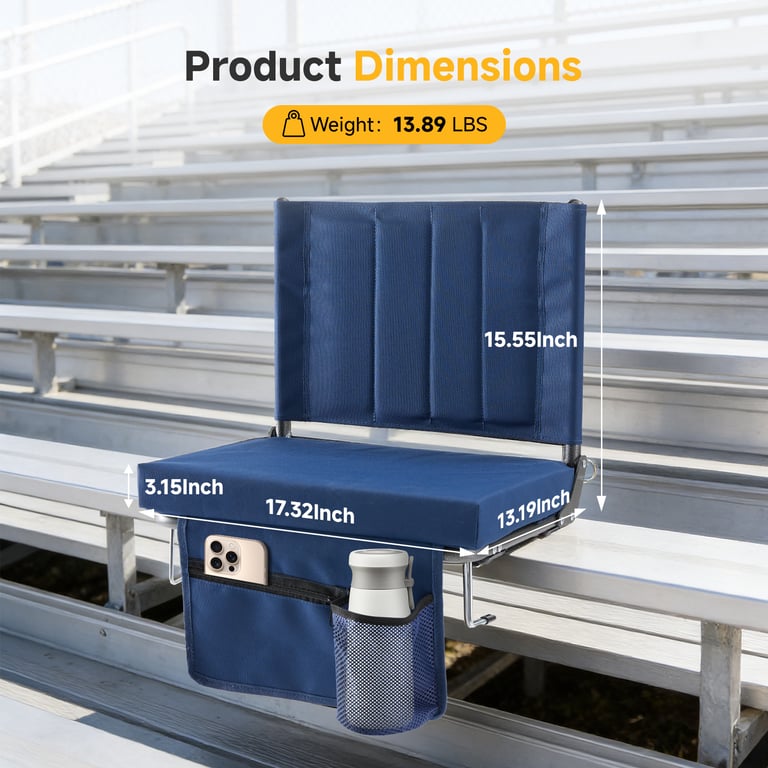 <p>Attending live sports, concerts, or outdoor events shouldn't mean sacrificing comfort—stadium seats with backrest support transform bleacher experiences with ergonomic design and practical storage. Our thick-padded stadium seat delivers the support your back needs during hours of sitting, eliminating the pain and fatigue of hard metal bleachers.</p><ul><li><strong>Lumbar Backrest Support</strong> — High-density foam backing contours to your spine, reducing lower back strain during extended sitting at games or outdoor venues</li><li><strong>Thick Cushioned Seat</strong> — 3-inch premium padding distributes weight evenly, preventing pressure points and discomfort on hard stadium seating</li><li><strong>Dual Cup Holders</strong> — Integrated holders keep beverages secure and within arm's reach, preventing spills during cheering or movement</li><li><strong>Multiple Storage Pockets</strong> — Zippered compartments store phones, keys, wallets, and snacks without taking up lap space or requiring a separate bag</li><li><strong>Portable Design with Straps</strong> — Padded shoulder straps and built-in handles make carrying effortless, while the step-like base grips bleachers securely without slipping</li></ul><p><strong>Perfect for:</strong> Season ticket holders who attend 10+ games annually, parents managing multiple children at youth sports events, and concert enthusiasts who value comfort during long outdoor performances.</p><p>Constructed from durable polyester-nylon fabric with a reinforced metal frame, this stadium seat weighs 13.89 lbs and measures 17.32" W × 13.19" D × 15.55" H, fitting standard bleacher widths. Available in classic black and vibrant blue.</p><p>✅ Fast shipping across Canada · 30-day returns · Secure checkout</p><p>Stock limited—order today to secure your comfort at this season's biggest events.</p>