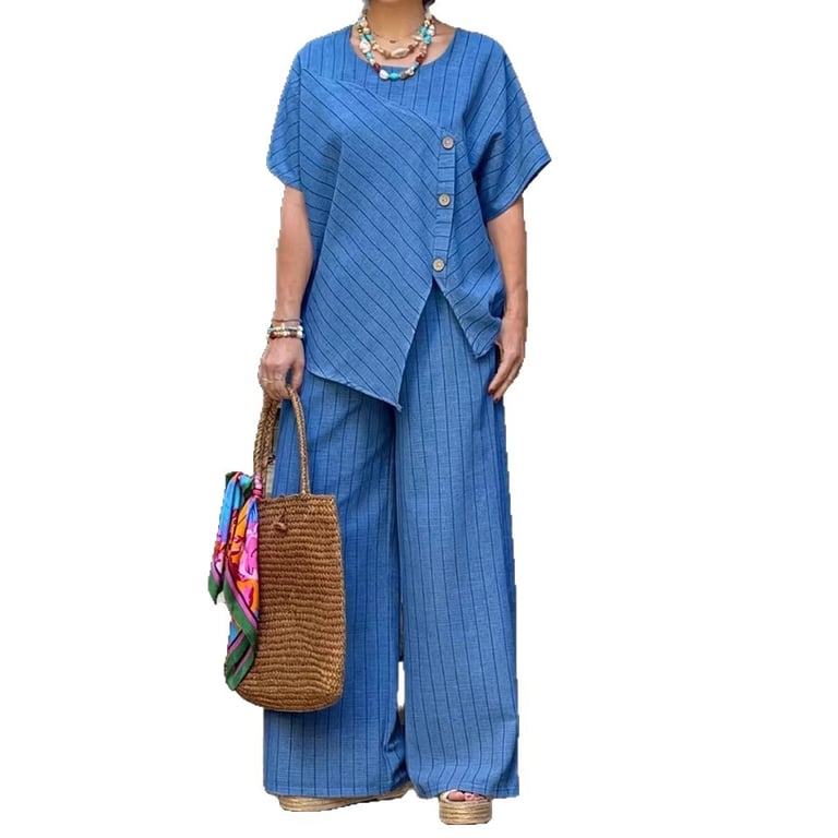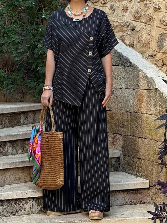 <p>Finding a coordinated outfit that balances comfort with effortless style shouldn't require hours of shopping. This striped two-piece set delivers both—a thoughtfully designed ensemble that works for casual weekends, travel, or relaxed workdays without sacrificing sophistication.</p><ul><li><strong>Asymmetrical Button Closure</strong> — The unique off-center front design adds visual interest and modern flair while maintaining easy, everyday wearability</li><li><strong>Lightweight Linen-Blend Fabric</strong> — Breathable material keeps you cool in warm weather while resisting wrinkles better than pure cotton alternatives</li><li><strong>Wide-Leg Loose Fit</strong> — Generous proportions provide all-day comfort and movement, flattering multiple body types without clinging or restricting</li><li><strong>Five Versatile Colorways</strong> — Choose from yellow, blue, beige, white, or black striped options that coordinate with existing accessories and wardrobe staples</li><li><strong>Pre-Coordinated Styling</strong> — Eliminates decision fatigue by pairing complementary pieces that work together, reducing outfit planning time</li></ul><p><strong>Perfect for:</strong> Women aged 30-60 seeking relaxed-fit casual wear, travelers needing packable layering pieces, and anyone preferring bohemian-inspired comfort clothing that transitions from home to social settings.</p><p>Crafted from quality mid-range linen blend with reinforced seams and secure button construction designed to withstand regular wear and washing.</p><p>✅ Fast shipping across Canada · 30-day returns · Secure checkout</p><p>Stock is limited in popular colors—reserve your preferred shade today before sizes sell out.</p>