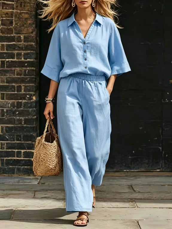 <p>Finding a coordinated outfit that doesn't sacrifice comfort for style is a challenge most Canadian women face. Our women's linen two-piece set solves this by pairing a relaxed short-sleeve button-down shirt with perfectly proportioned loose pants—all in one effortless purchase.</p><ul><li><strong>Premium Linen-Blend Fabric</strong> — Breathable, temperature-regulating material that keeps you cool in summer and layers beautifully in transitional seasons</li><li><strong>Versatile Color Range</strong> — Choose from five curated shades (green, beige, light blue, yellow, white) that mix-and-match with your existing wardrobe</li><li><strong>Relaxed Fit Design</strong> — V-neckline and wide-leg silhouette flatters all body types while allowing full range of motion for active days</li><li><strong>Elastic Waistband Comfort</strong> — No pinching or adjusting needed; wear from morning meetings to evening errands without discomfort</li><li><strong>Coordinated Styling</strong> — Pre-matched pieces eliminate decision fatigue and guarantee a polished, intentional look every time</li></ul><p><strong>Perfect for:</strong> Work-from-home professionals seeking elevated loungewear, weekend travelers who need packable outfits, and women aged 25–55 who prioritize both comfort and contemporary aesthetics.</p><p>Crafted from quality linen-blend construction designed to soften with every wash, this set maintains its shape and color through regular wear. Each piece is thoughtfully cut to flatter without clinging.</p><p>✅ Fast shipping across Canada · 30-day returns · Secure checkout</p><p>Stock is limited on trending colors—secure your preferred shade before sizes sell out.</p>